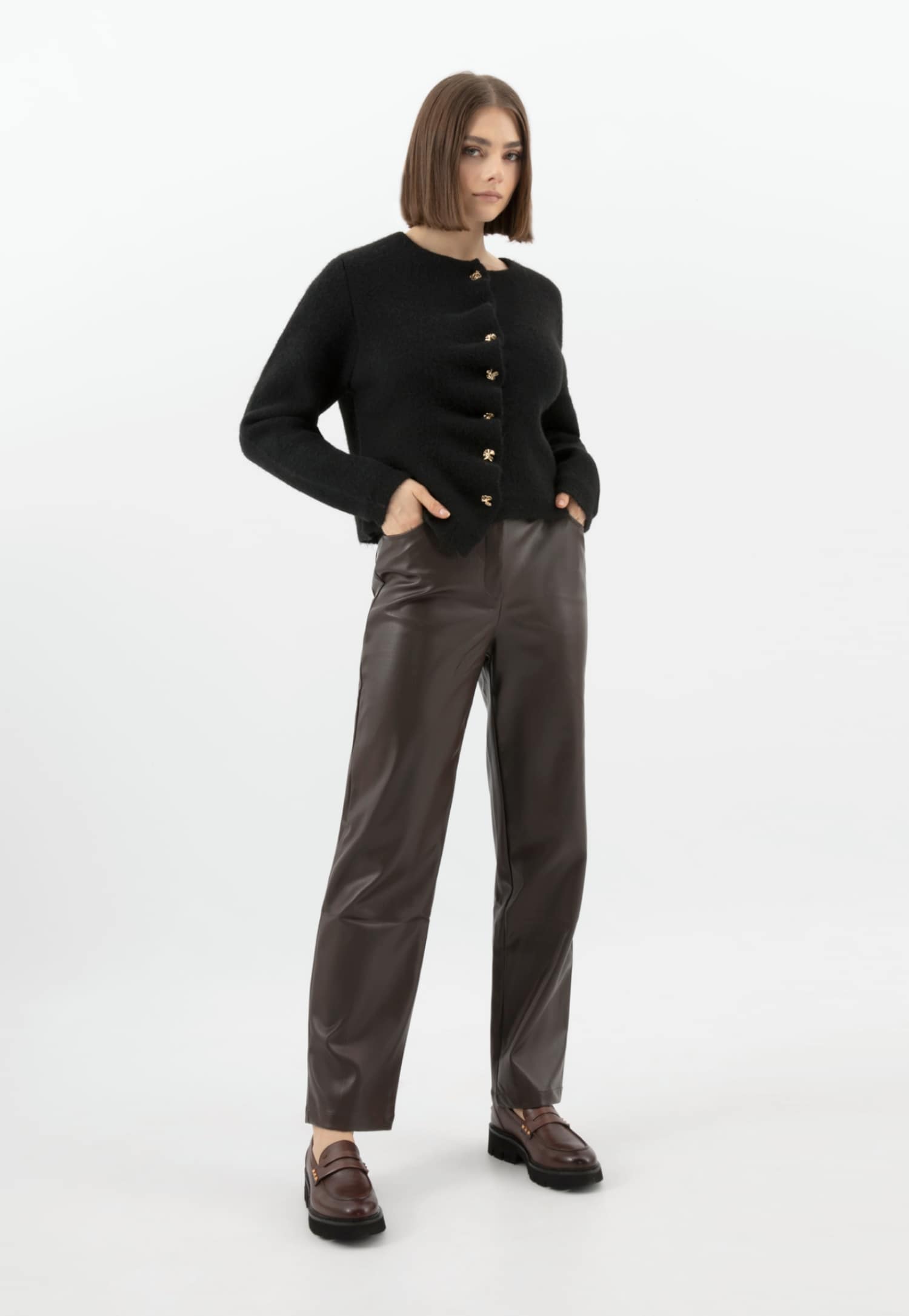 Brown leather loafers with gold decoration